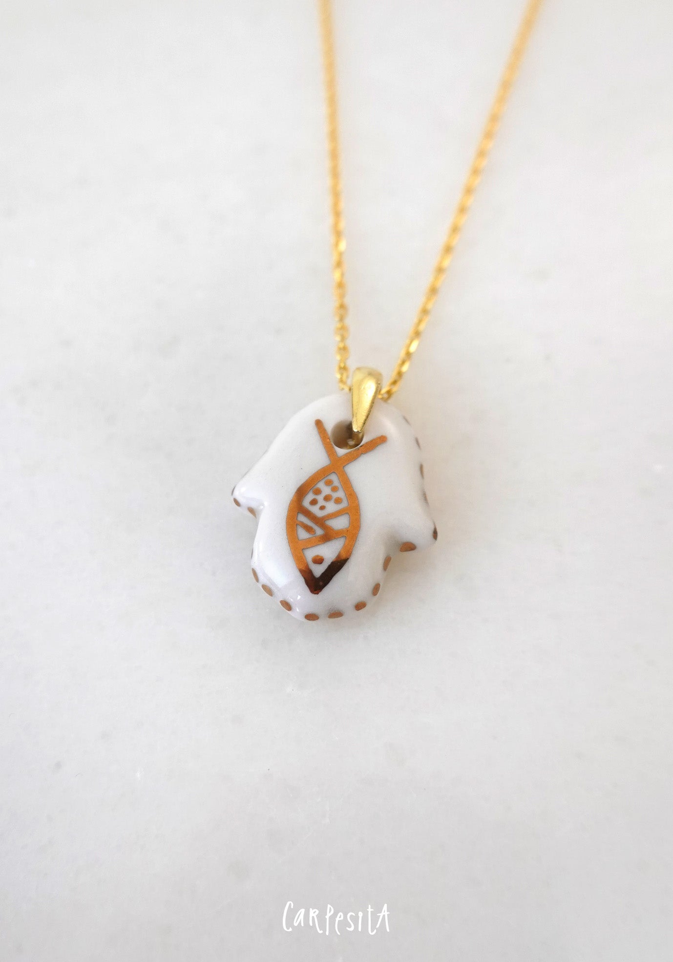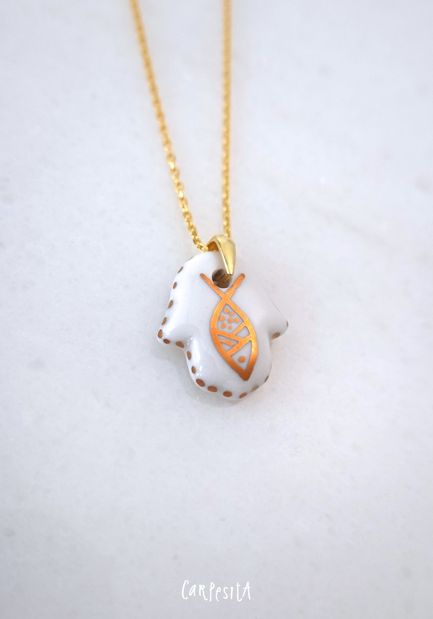 Beyaz Balık Desenli Hamsa Kolye