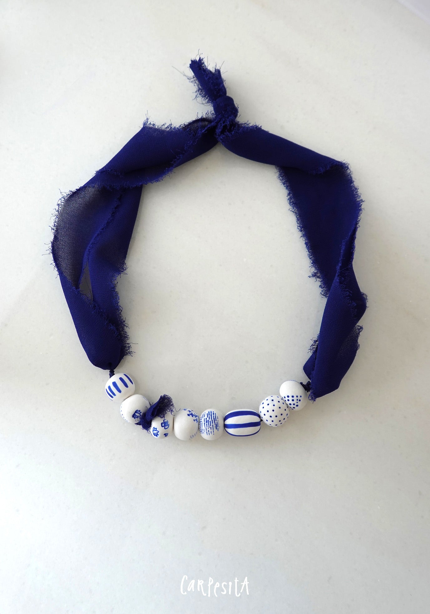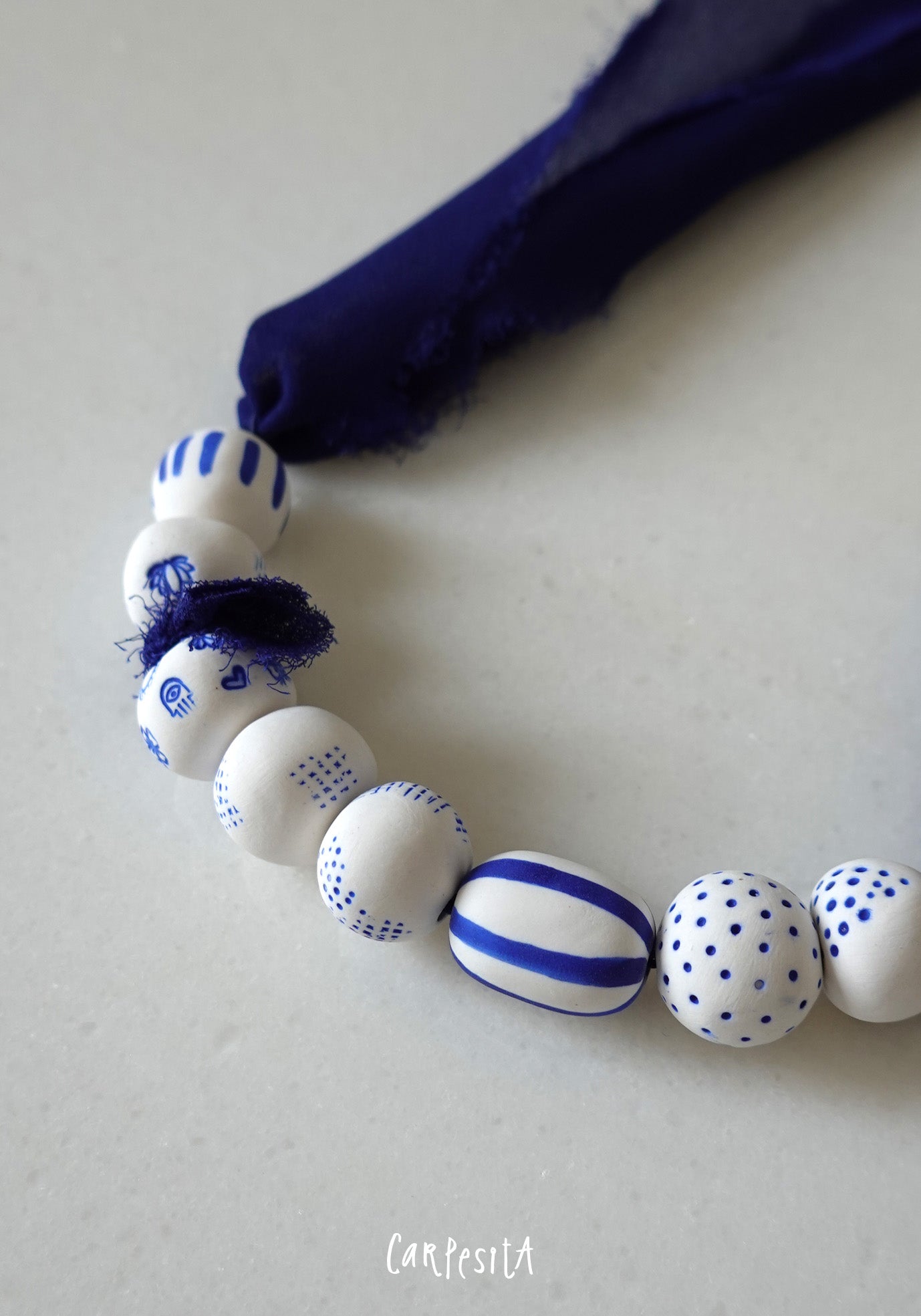Tamamen el yapımı, desenli beyaz porselen parçalarla oluşturulmuş, tek parça olarak tasarlanan kolye. Şifon kurdele ile örülen askı kısmının uzunluğunu dilerseniz kendinize göre ayarlayabilirsiniz.