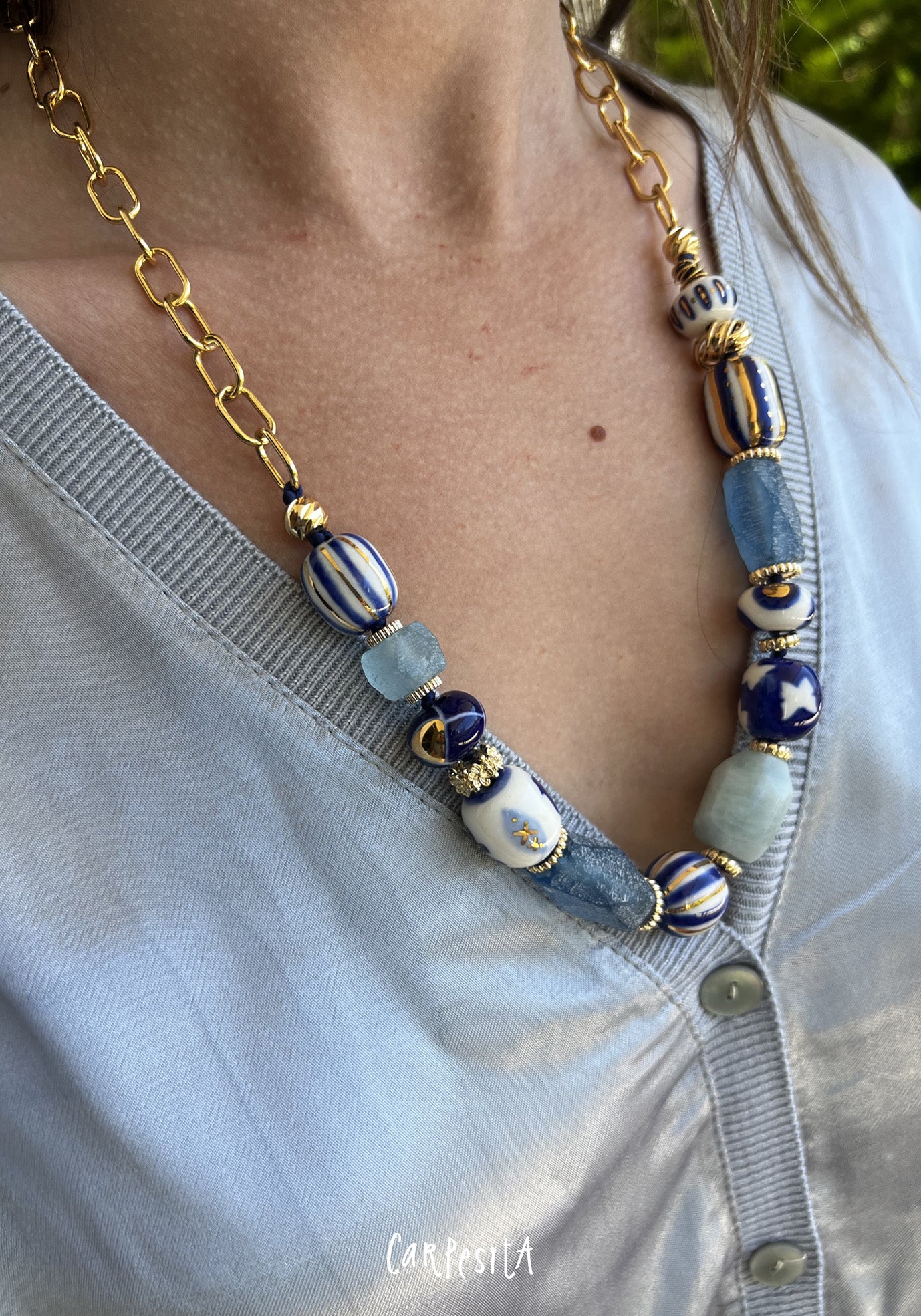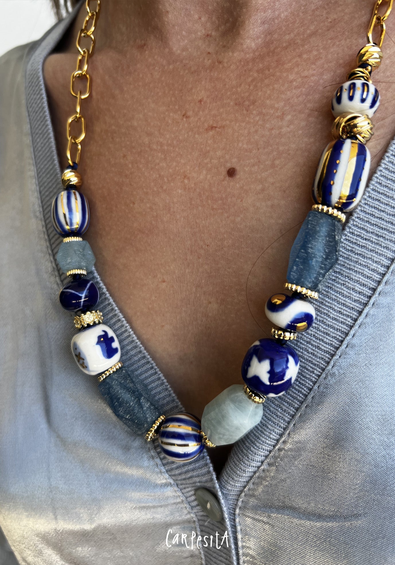Sadelik ve gösterişin mükemmel dengesini yakalayın. El yapımın özel porselen parçalar, doğal kuvarz taşlar ve altın kaplama metal parçaların kullanıldıği, tek parça olarak tasarlanan kolye.