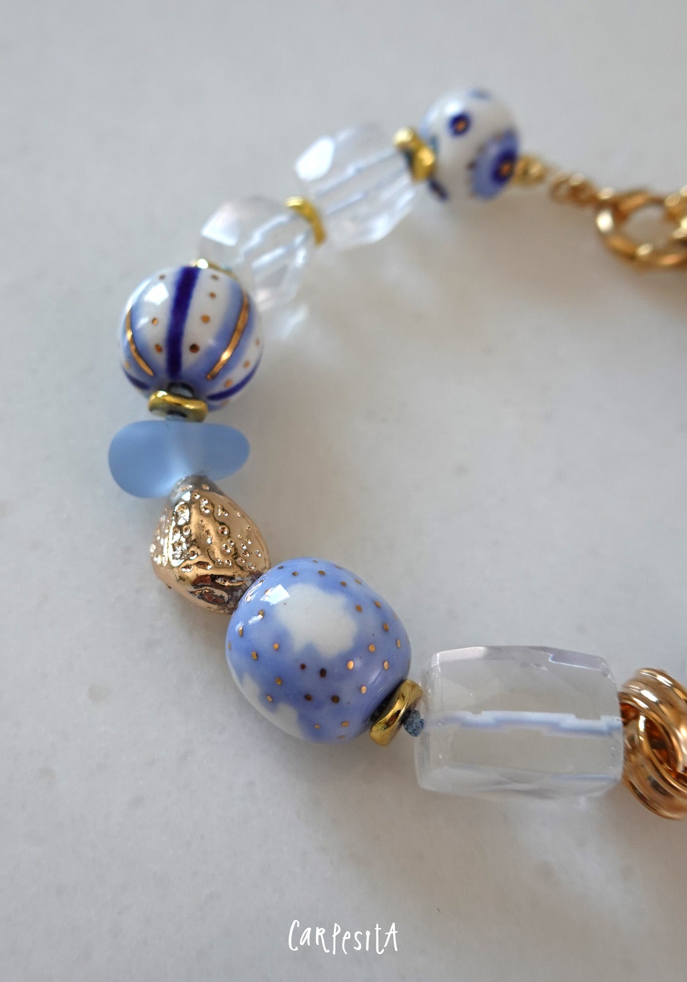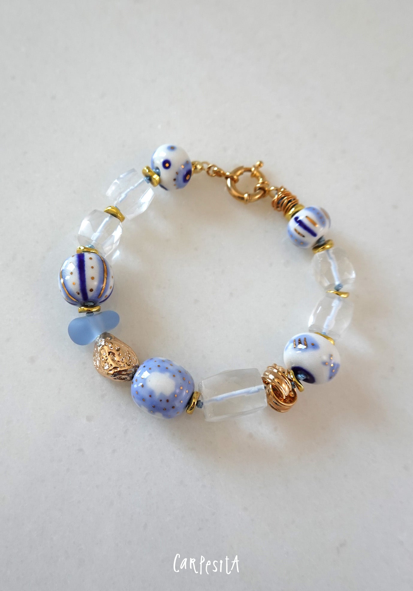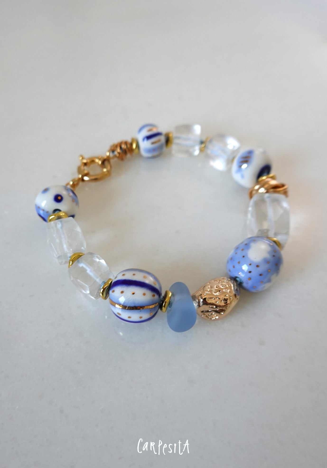 Gerçek şeffaf kuvars taşlar, deniz camı, altın kaplama bakır ara metallerle tasarlanan, tek parça olarak üretilen bileklik.