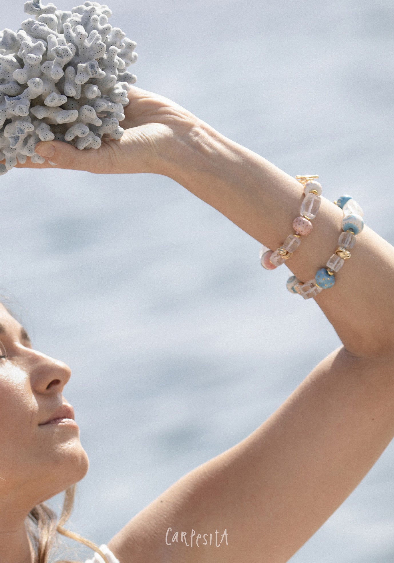 Gerçek şeffaf kuvars taşlar, deniz camı, altın kaplama bakır ara metallerle tasarlanan, tek parça olarak üretilen bileklik.